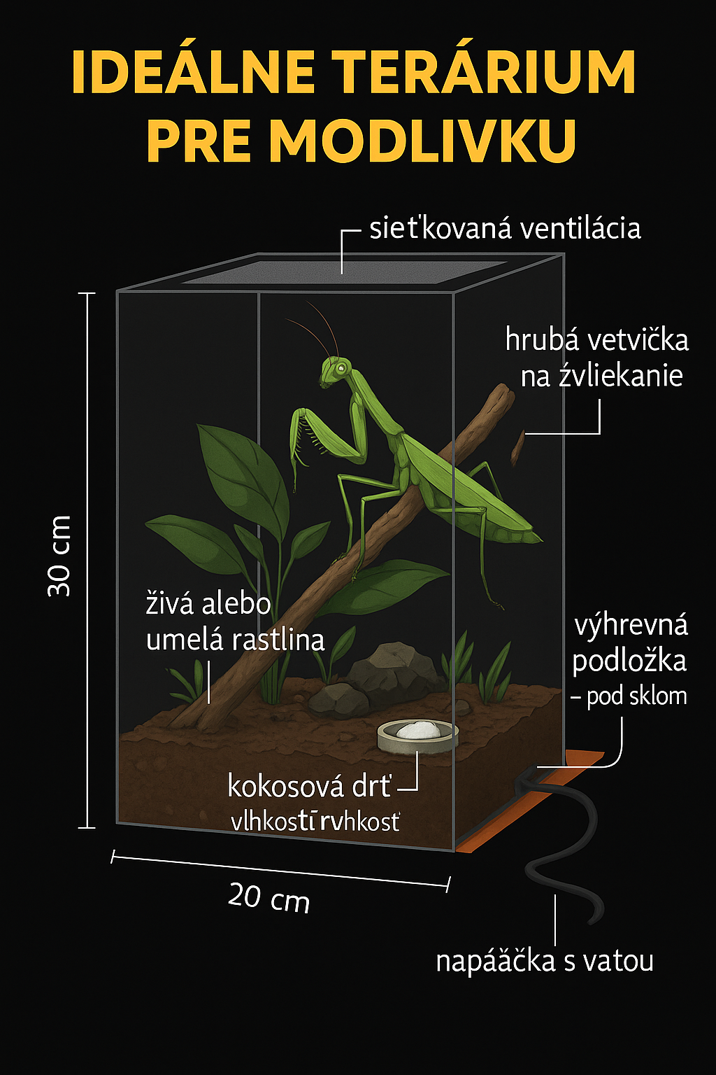 Zatiaľ čo pavúky preferujú horizontálne priestory, modlivky trávia väčšinu času zavesené hlavou dolu. Preto platí zlaté pravidlo: Výška terária by mala byť aspoň trojnásobkom dĺžky tela modlivky.