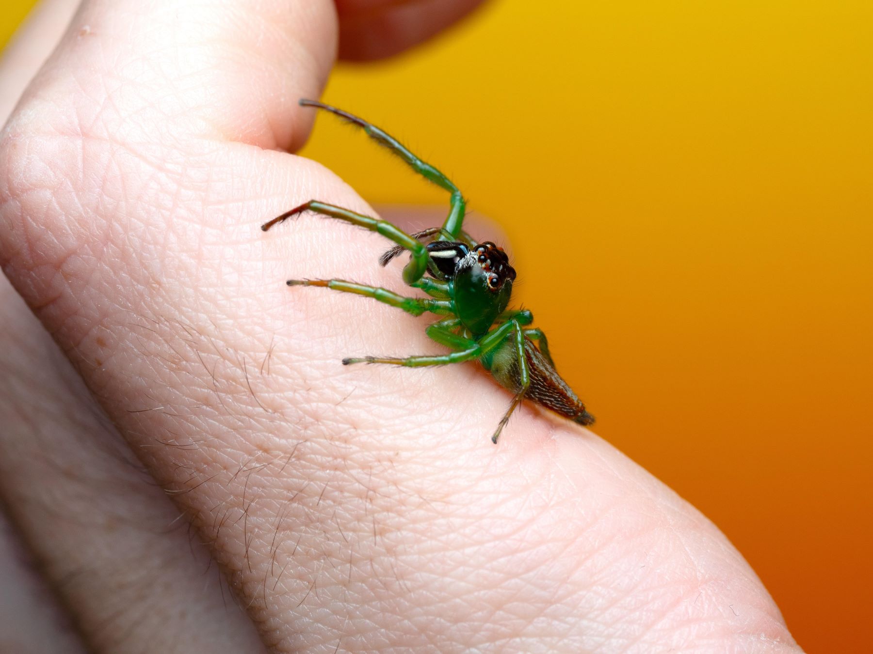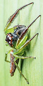 Patrí medzi skákavky, kde obe pohlavia očaria svojím unikátnym sfarbením – samice sú ružové, v ojedinelých prípadoch žlté s tansparentným efektom , u samcov tmavé telo kontrastuje s výrazne červenou hlavou a kriklavo-zeleným robusným telom. Tento tropický druh pochádzajúci z juhovýchodnej Ázie očarí svojou veľkostou, je zberateľským klenotom a zároveň fascinujúcim druhom na pozorovanie. K dispozicii rozne veľkosti.