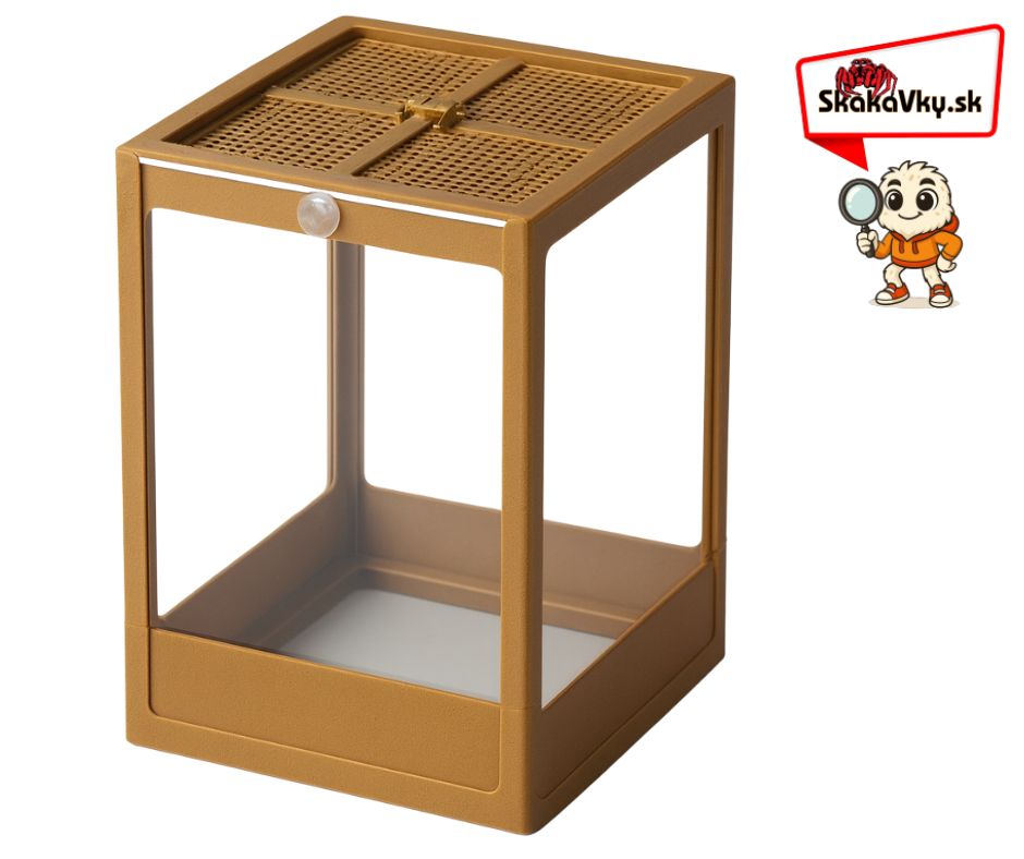 Originálne dizajnové terárium z našej dielne pre skákavky, modlivky a okrasný hmyz – ekologické, bezpečné a štýlové. Finálna verzia s vylepšeným vrchným vetraním a praktickým predným otváraním. Veľkosť /š x d x v/: 11 cm x 11 cm x 15,5 cm. Farba: čierna, biela, deluxe /svetlé drevo/.