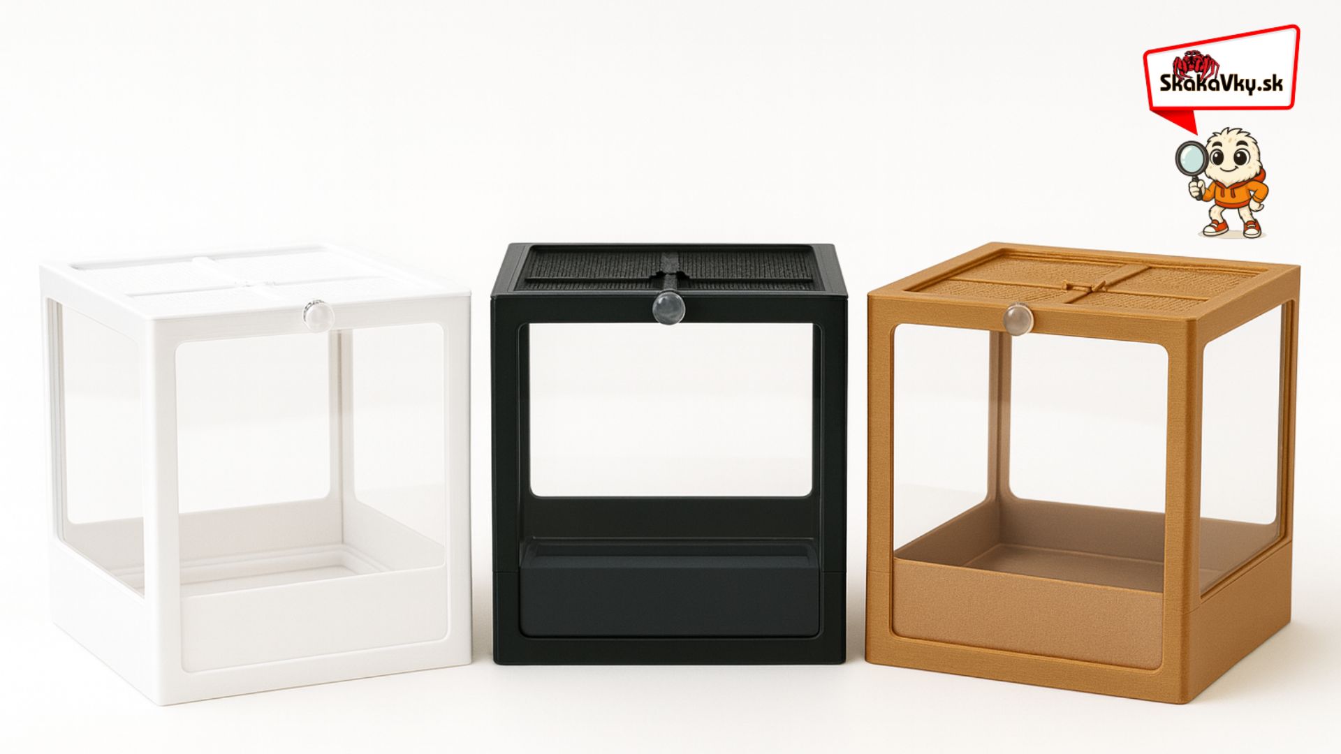 Dizajnové terárium CuteMonsters KLASIK M – ideálne pre skákavky, pavúky, hmyz a malé plazy. Ekologické, štýlové a funkčné riešenie pre každého chovateľa. Rozmery (Š × D × V): 110 × 110 × 110 mm. Farba: čierna, biela, deluxe /svetlé drevo/.